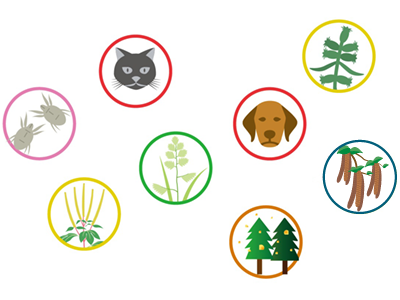 この検査は、スギ花粉やダニ、イヌやネコのフケなど、みなさんが吸い込んでしまう可能性のあるアレルゲン(アレルギーを起こす物質)に反応する「IgE」という抗体がからだの中にあるかどうかを調べるためのものです。